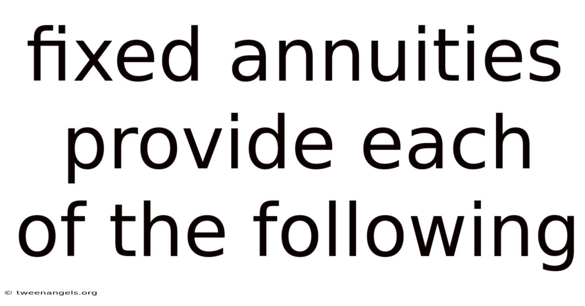 Fixed annuities provide each of the following: a reliable source of guaranteed income, principal protection against market volatility, tax-deferred growth potential, and predictable payout schedules suited to individual financial needs. These financial instruments are designed to offer stability and security, making them a popular choice for retirees or individuals seeking to preserve capital while ensuring a steady cash flow. By understanding the core features fixed annuities deliver, investors can make informed decisions about incorporating them into their long-term financial strategies Simple, but easy to overlook..