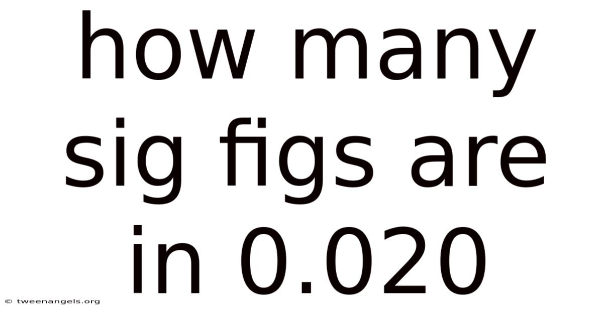 To determine the number of significant figures in 0.020, we must look at each digit carefully. The digits 2, 0, and 0 are all significant. On top of that, the first digit after the decimal is 2, which is the most precise value. The second digit is 0, which is significant because it is not just a placeholder. Consider this: the third digit is another 0, which is less certain. This pattern shows that only the first three digits are meaningful in this case. Which means, 0.020 has three significant figures It's one of those things that adds up..